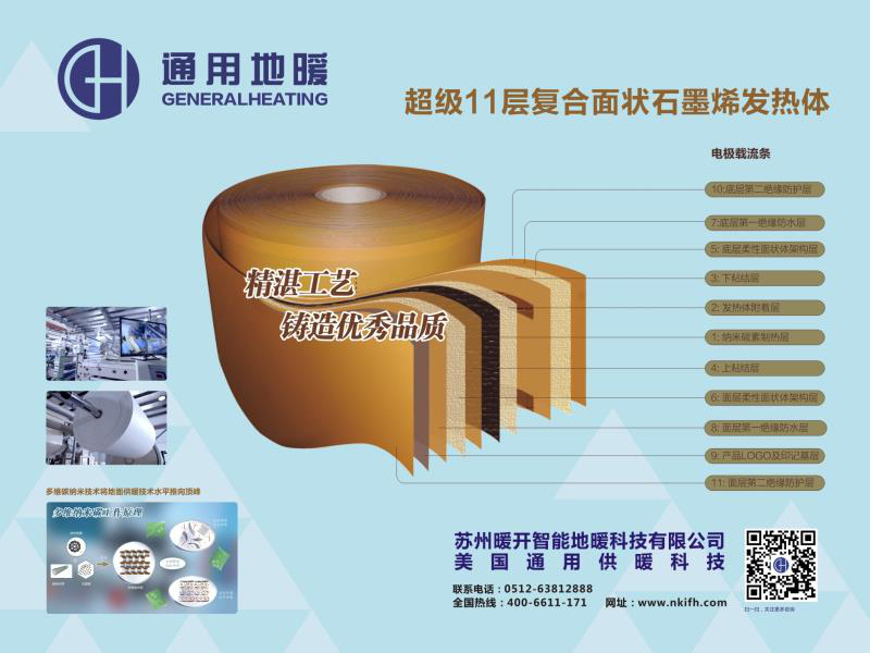 苏州暖开智能地暖科技有限公司,公司前身为美国通用供暖科技有限公司,在1996年创建于美国,是一家集研发、生产、销售 、安装于一体的一站式国际化供暖公司,是享誉全球20多年的地暖行业领导品牌,并参与编制了《中国电地暖行业标准》!在公司董事长严森根领导下组建了一支顶尖石墨烯研发团队,拥有国内发明专利“一种氧化石墨烯及其制备方法、用途”,(发明专利号:201510097110.9)等多项专利技术,并获得了中国建设部门重点推荐产品和电供暖行业蓝天奖等多项奖项,公司已通过CE认证、ISO9001:2008管理体系认证、ISO14001:2004环境管理体系。通用地暖具有并重视企业自身研发与科研实力,也因此成为中国电地暖行业的“璀璨新星”。